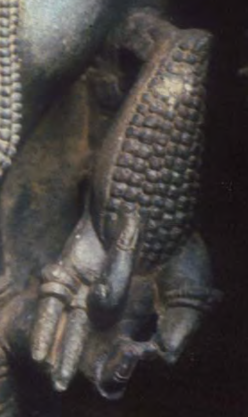 The above right photo is Halebid Muktaphala 19, a detail of whose "maize ear" appears above left. Note that although most of the husk has been removed, a portion of it is still visible on the right side! Some of the silk is also still present. The kernels grow shorter toward the tip. Johannessen and Parker note that this is typical of an immature maize ear presented as a "first harvest" offering.