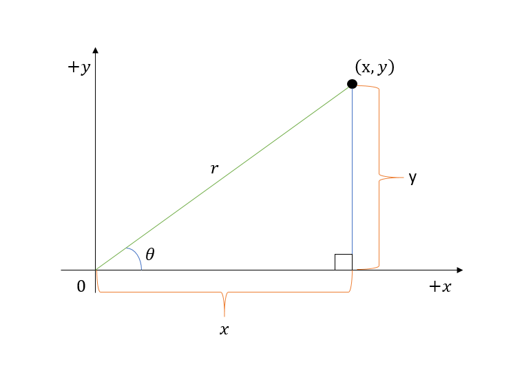 Maybe at some point you've already learned about polar coordinates. If not, that's ok, we'll give you a brief overview. The basic idea is that for every point ($x$,$y$) there is a distance $r$ to the origin, and an angle $\theta$ from the $x$ axis. Let's think about the relationship between $x$ and $y$ and $r$ and $\theta$.